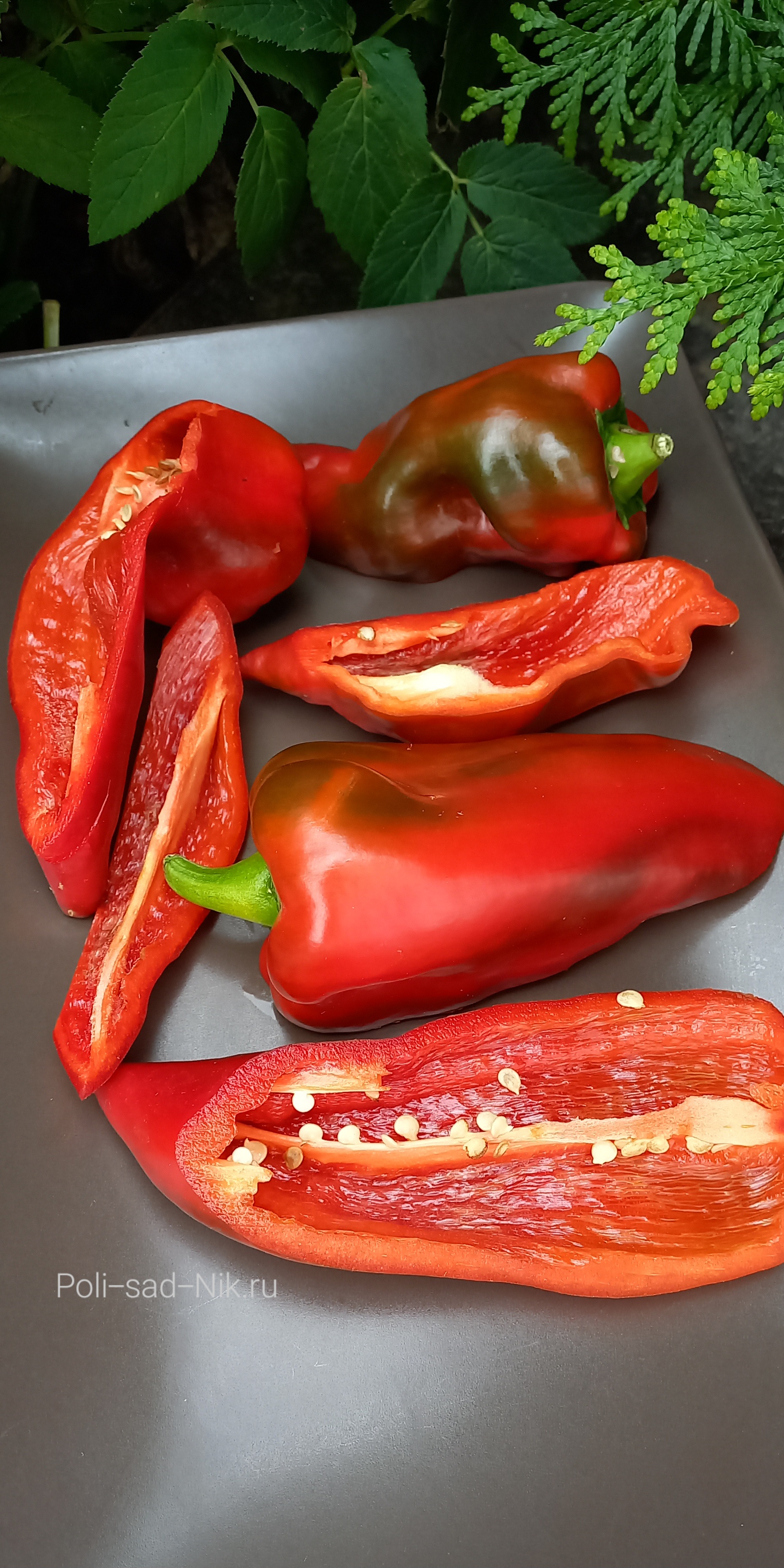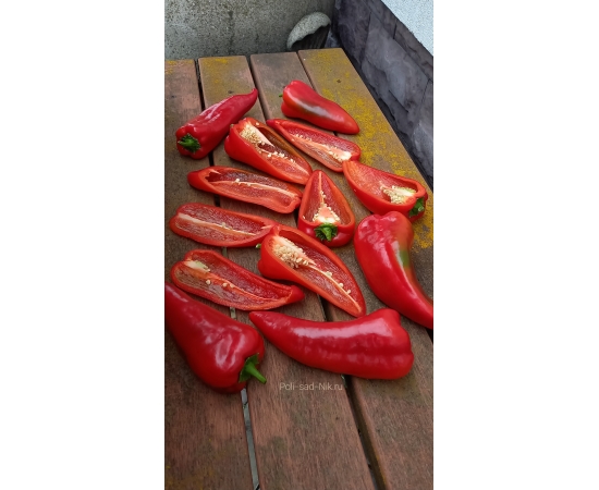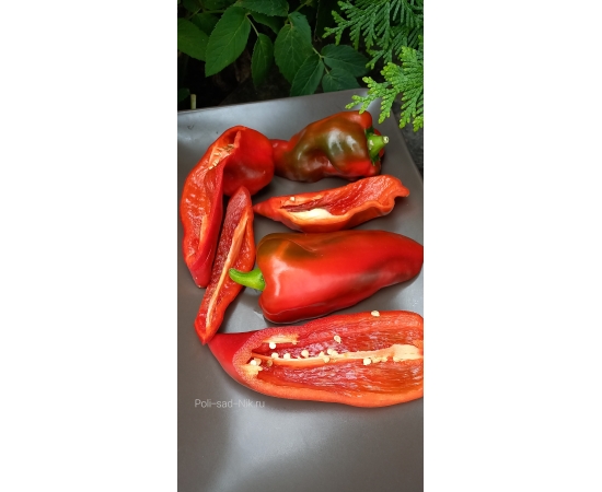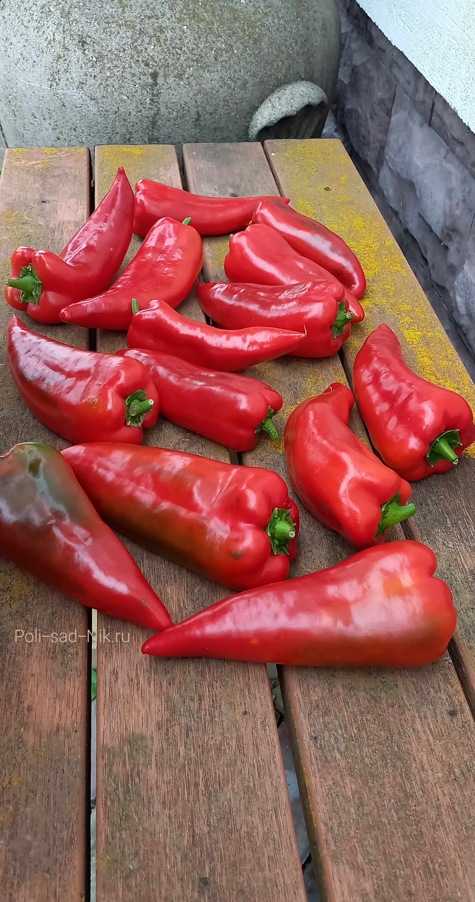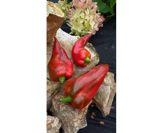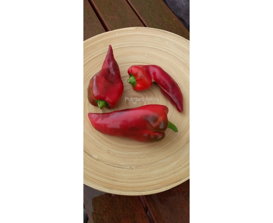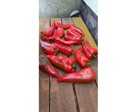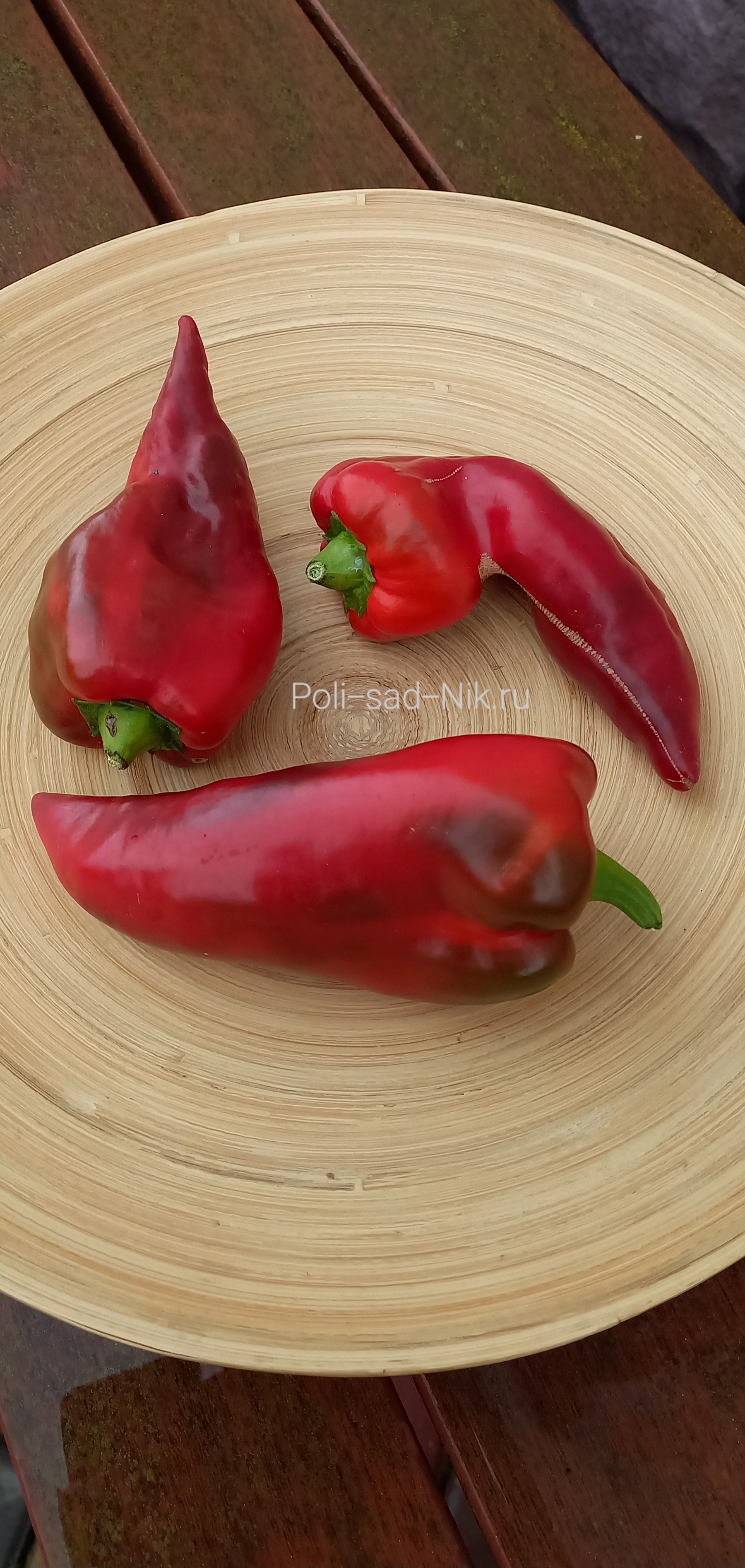 Сорт среднего срока созревания. Высота куста до 80 см. Плоды глянцевые, ярко красного цвета. конической формы, массой до 150 гр.Толщина стенки 5-6 мм.Мякоть сочная, сладкая. Сорт очень урожайный. Название сорта условное! Семена приобретались у коллекционера, под этим названием!