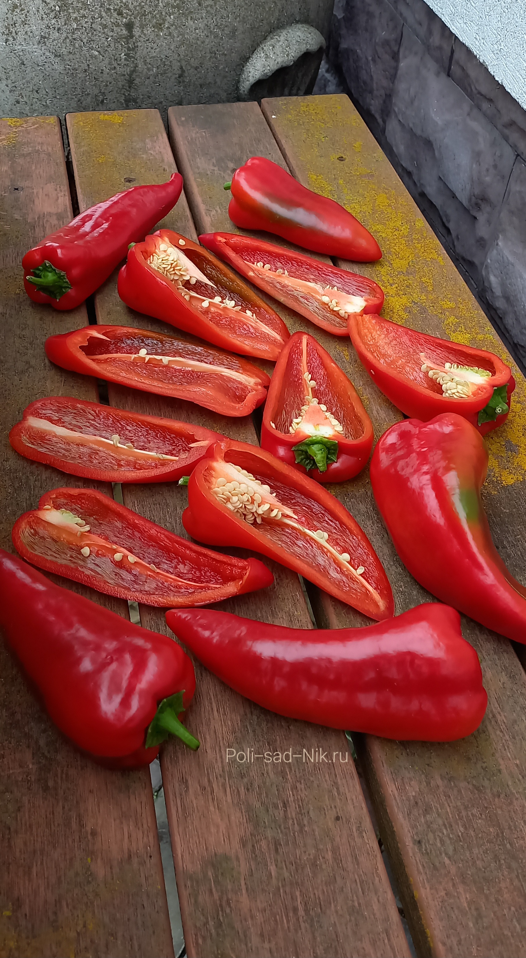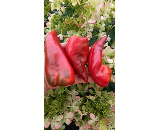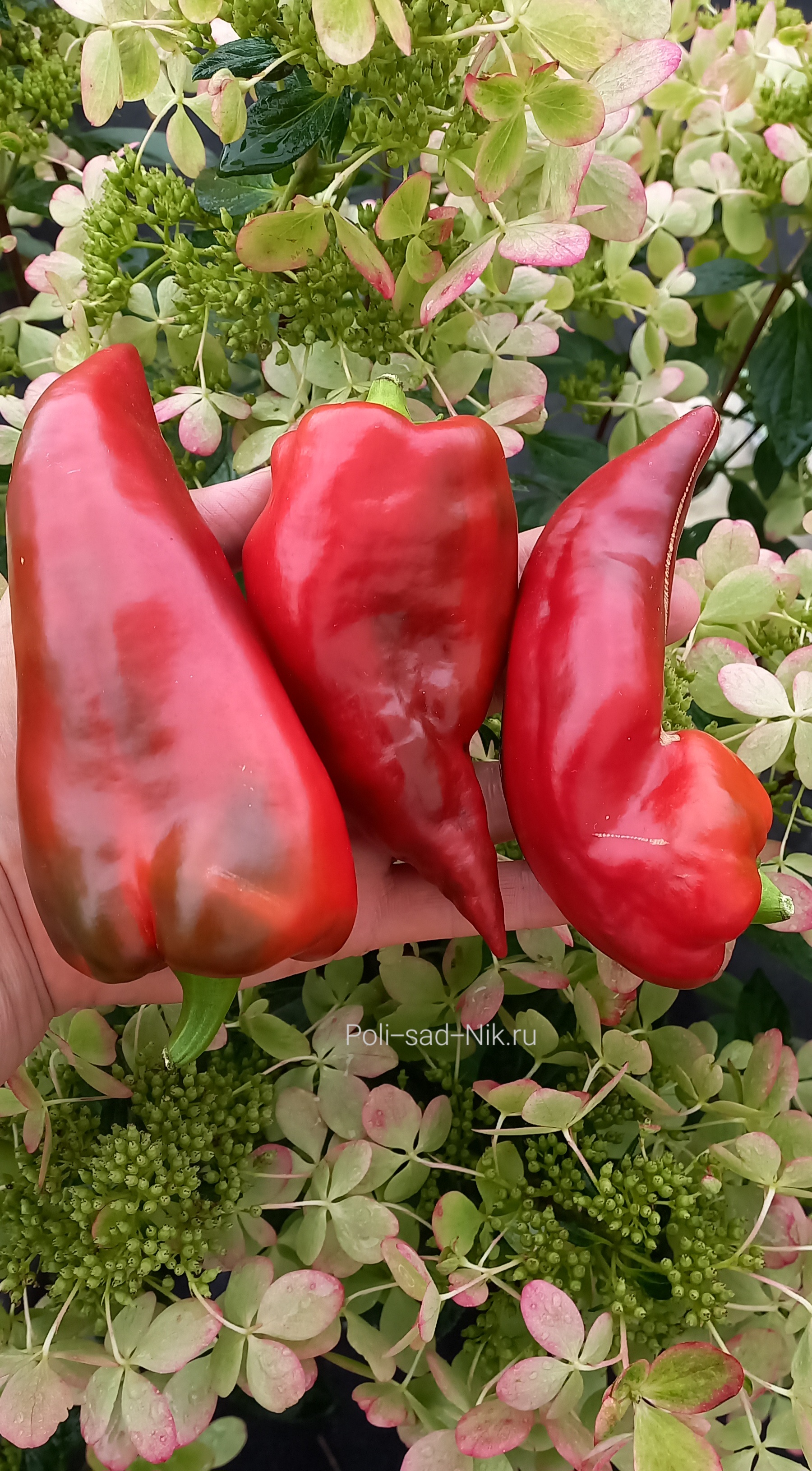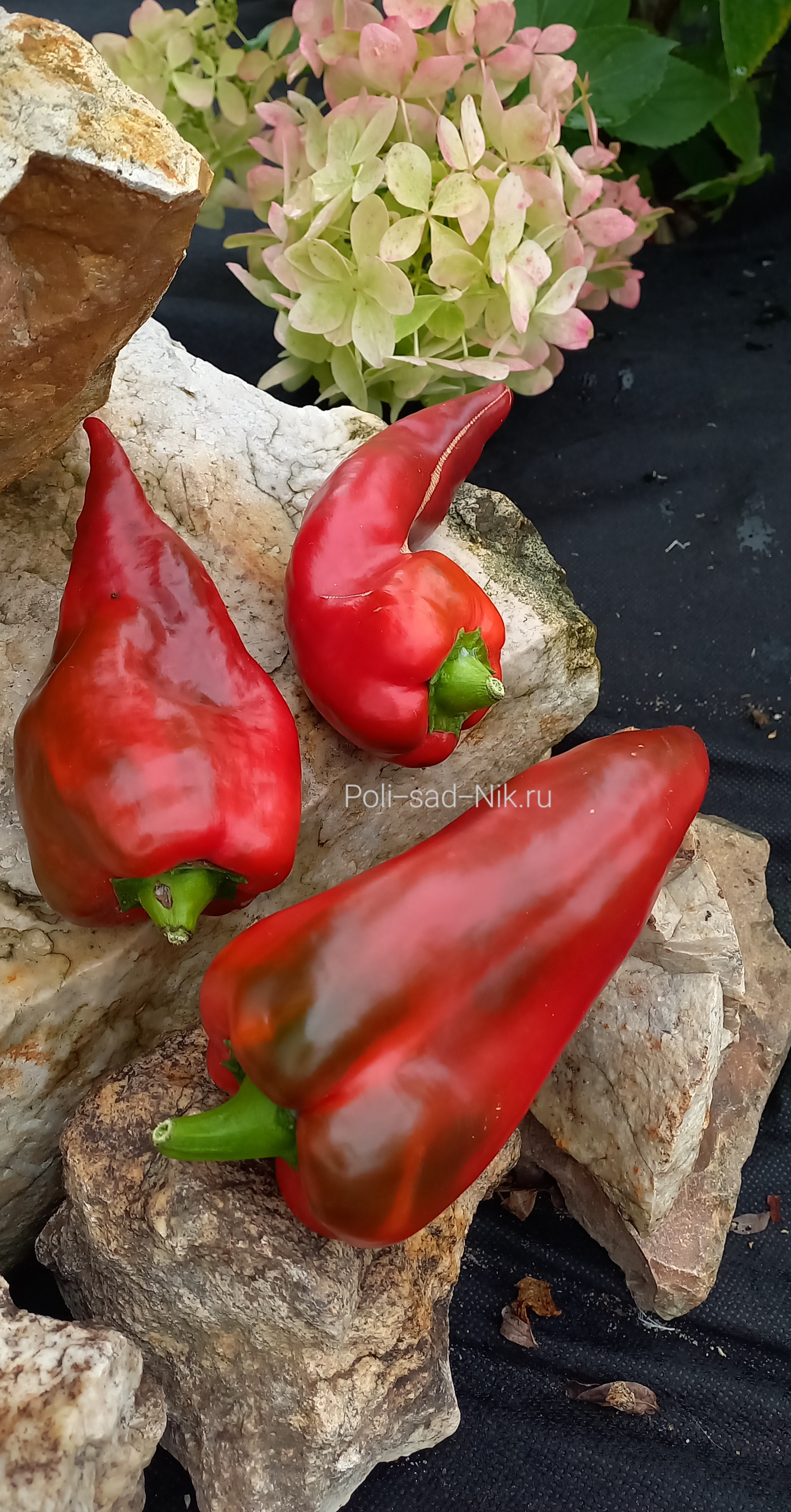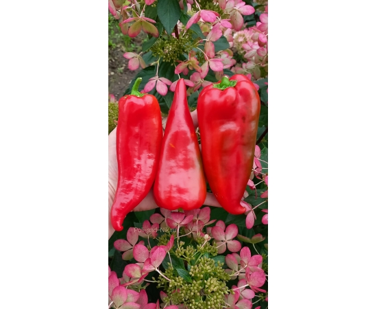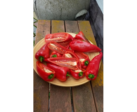 Сорт среднего срока созревания. Высота куста до 80 см. Плоды глянцевые, ярко красного цвета. конической формы, массой до 150 гр.Толщина стенки 5-6 мм.Мякоть сочная, сладкая. Сорт очень урожайный. Название сорта условное! Семена приобретались у коллекционера, под этим названием!