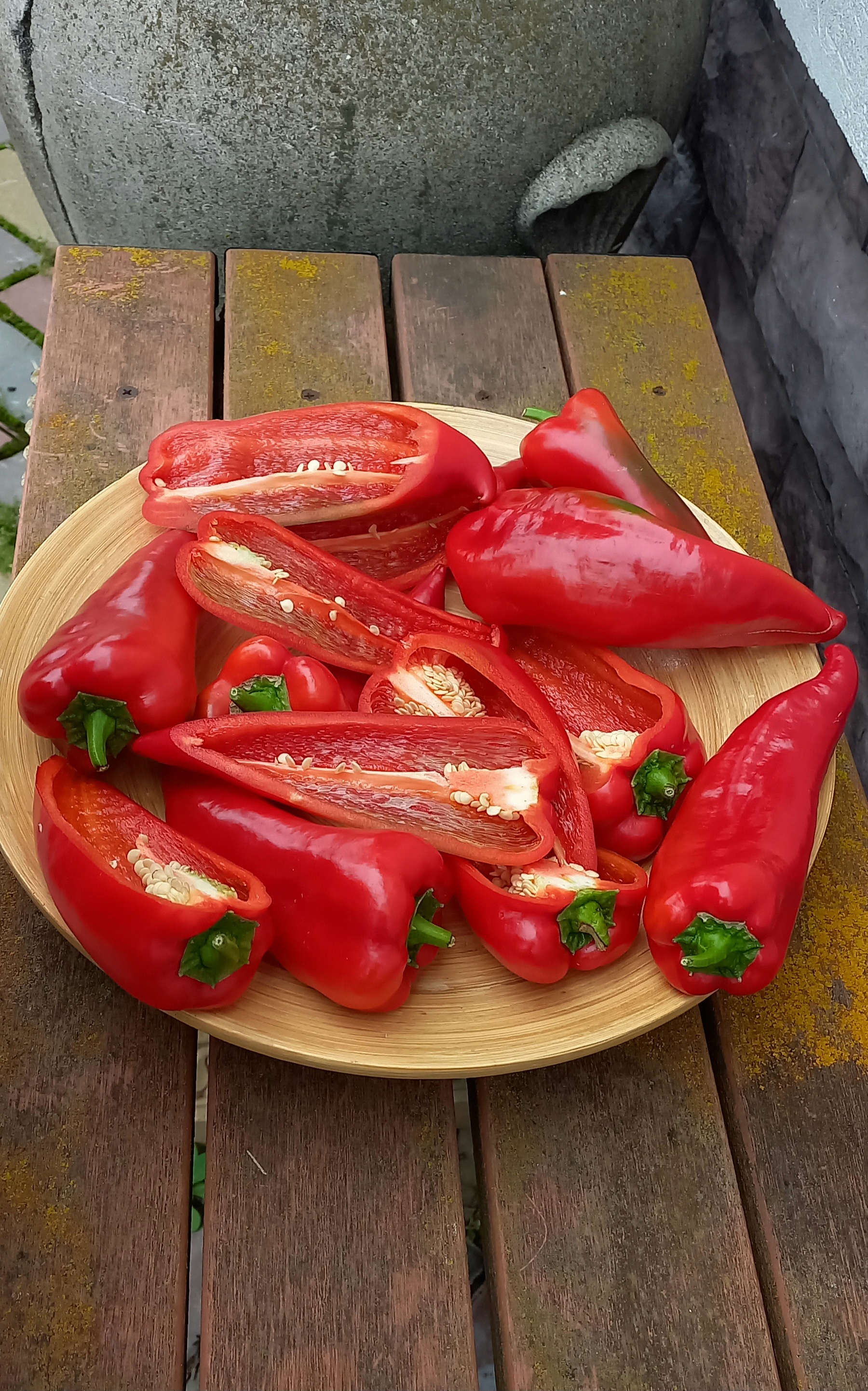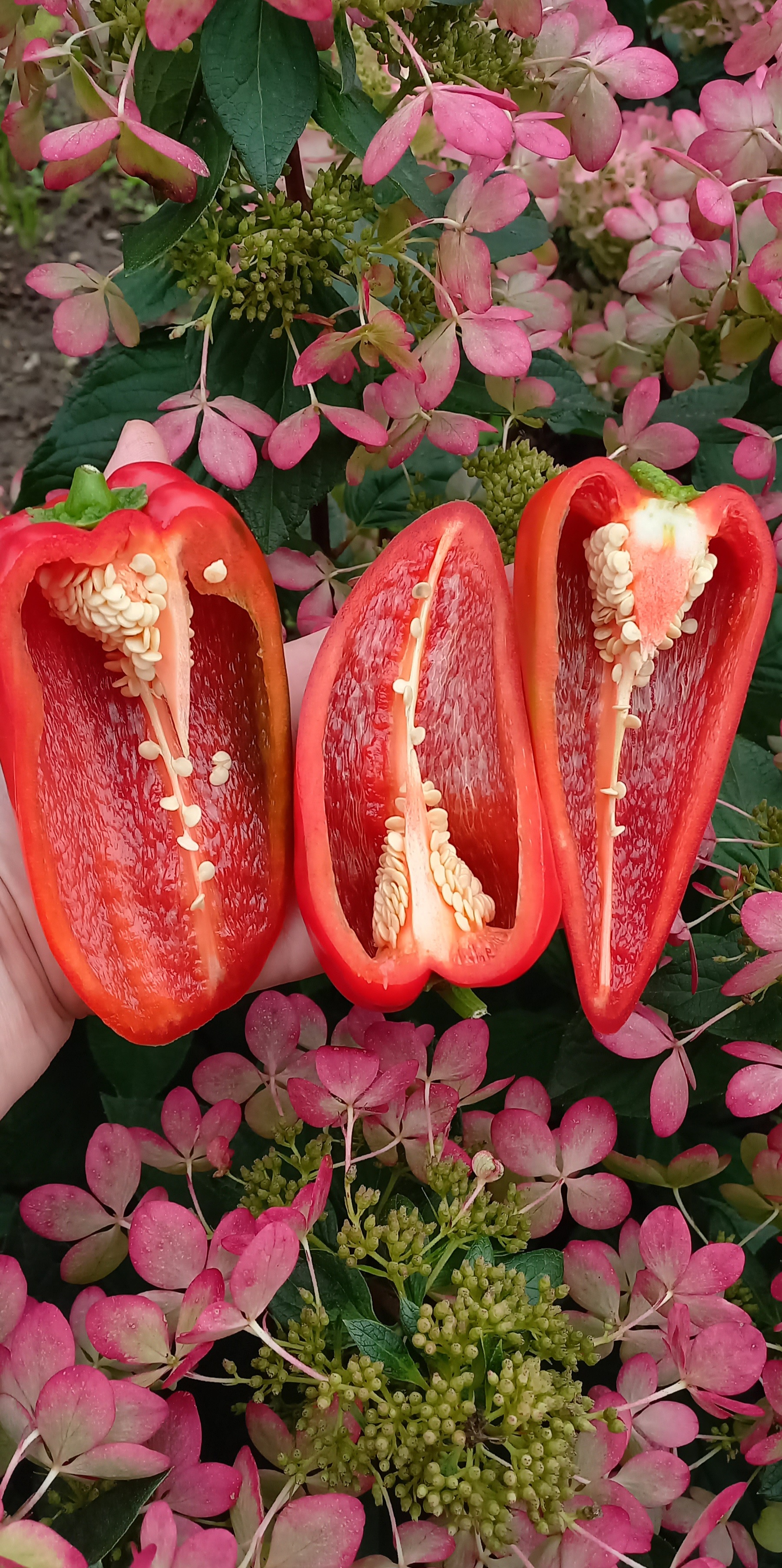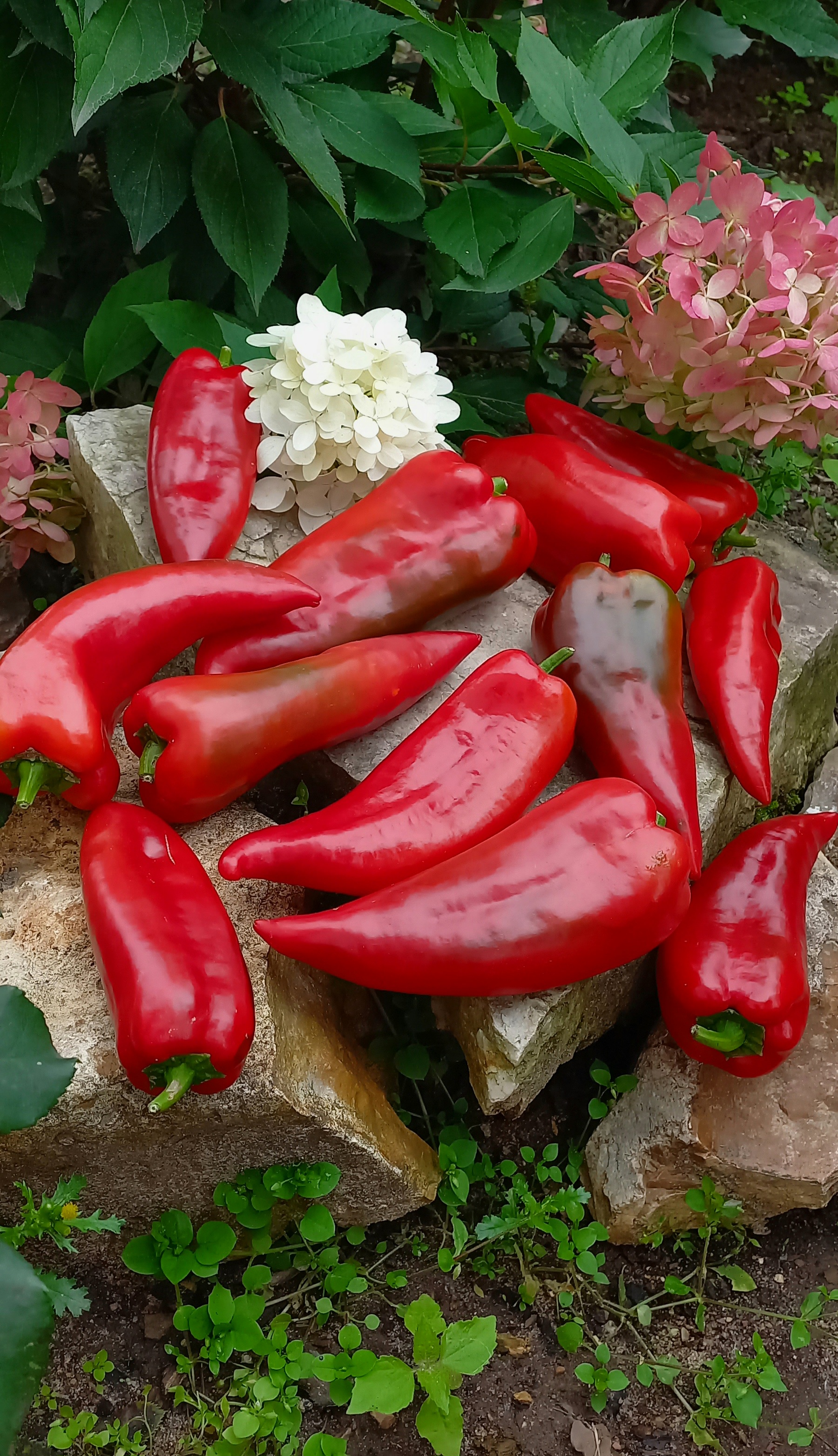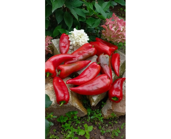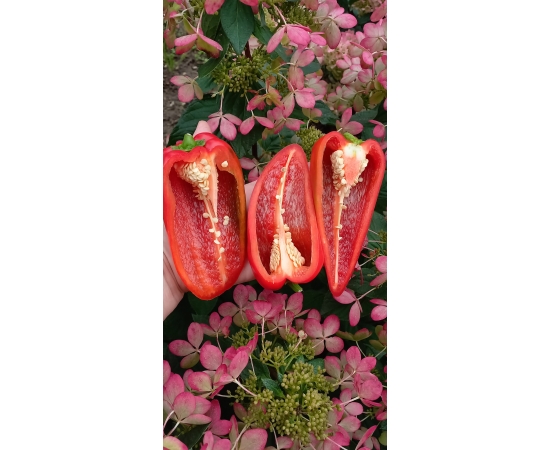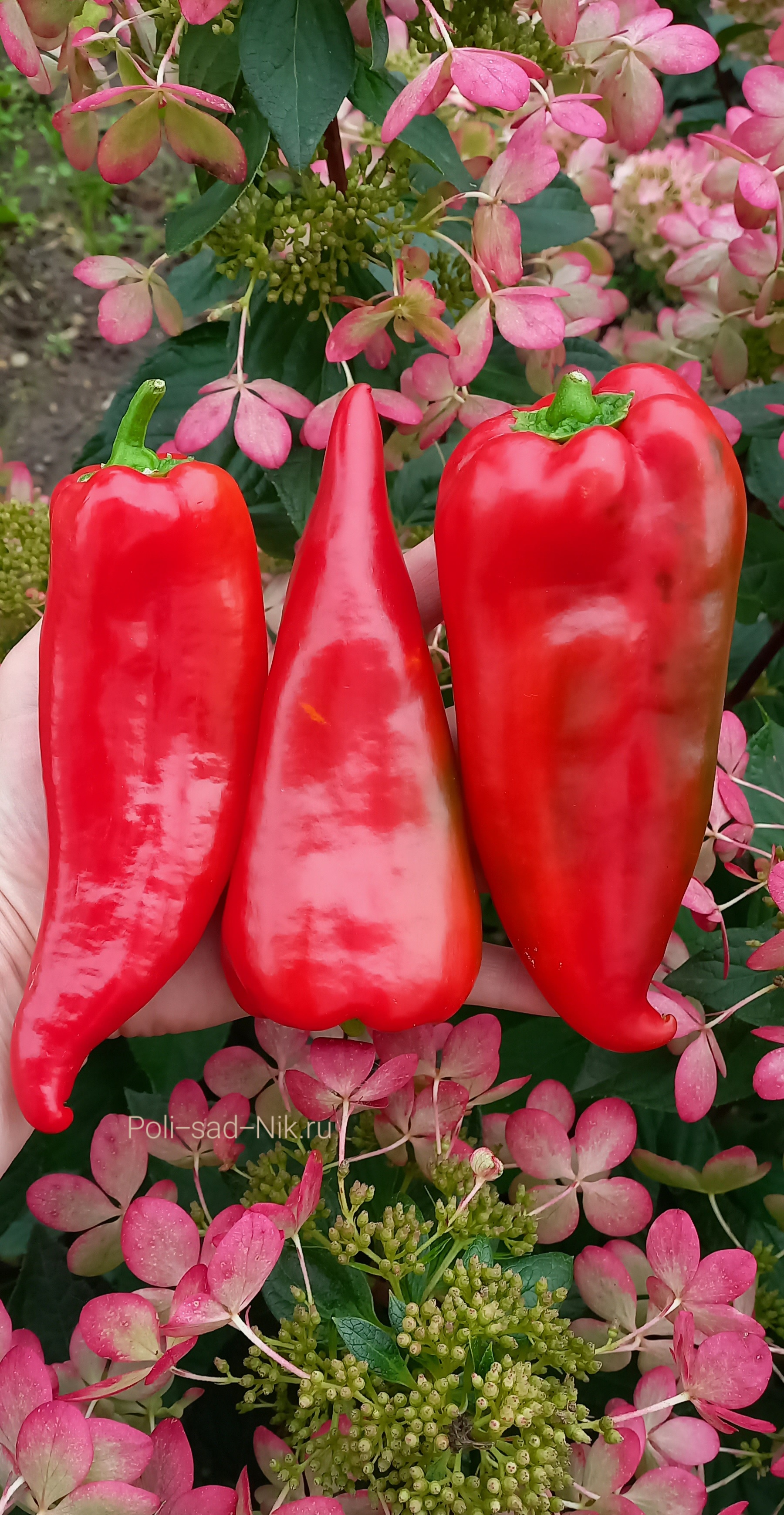 Сорт среднего срока созревания. Высота куста до 80 см. Плоды глянцевые, ярко красного цвета. конической формы, массой до 150 гр.Толщина стенки 5-6 мм.Мякоть сочная, сладкая. Сорт очень урожайный. Название сорта условное! Семена приобретались у коллекционера, под этим названием!