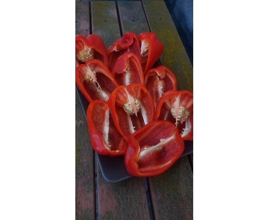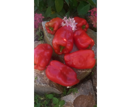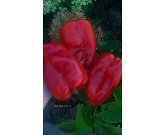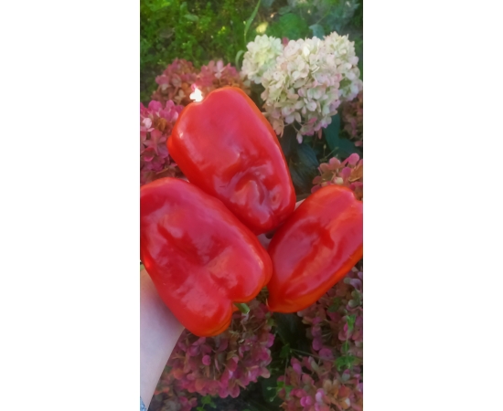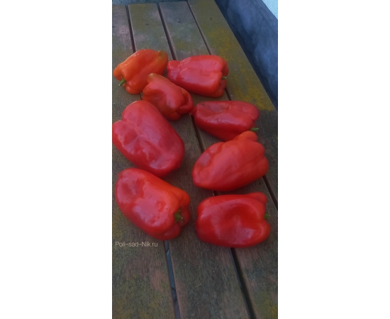 Среднеспелый сорт сладкого перца. Растение высотой до 80 см. Куст раскидистый, крепкий. Плоды удлиненной кубовидной формы , массой до 300 гр. Крупные, глянцевые , красивого алого цвета. Толщина стенки 8-9 мм. Мякоть сочная, ароматная, хрустящая. Сорт универсального назначения. Урожайность хорошая!