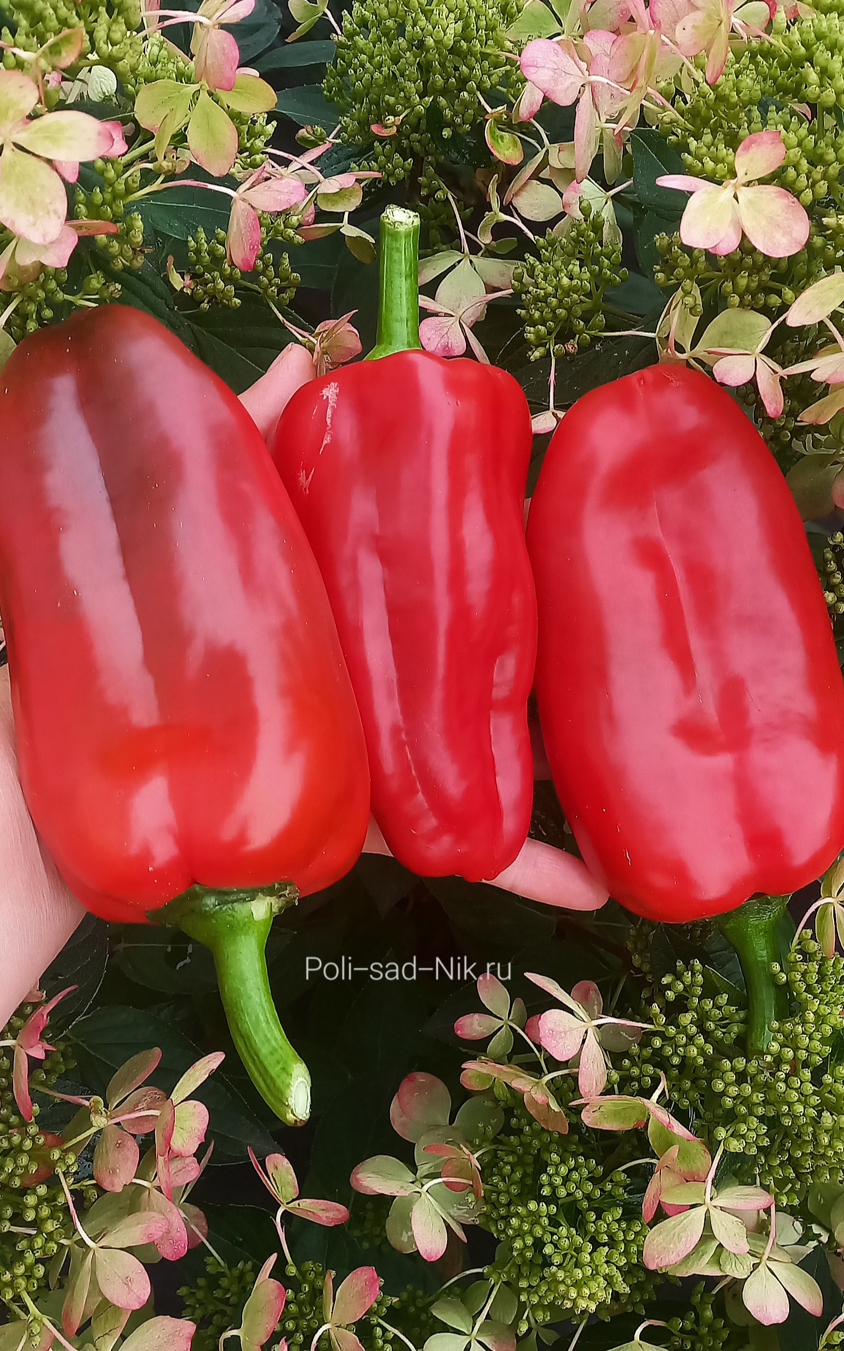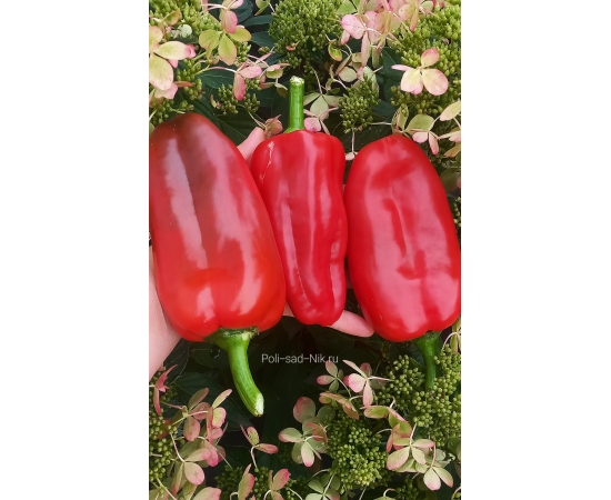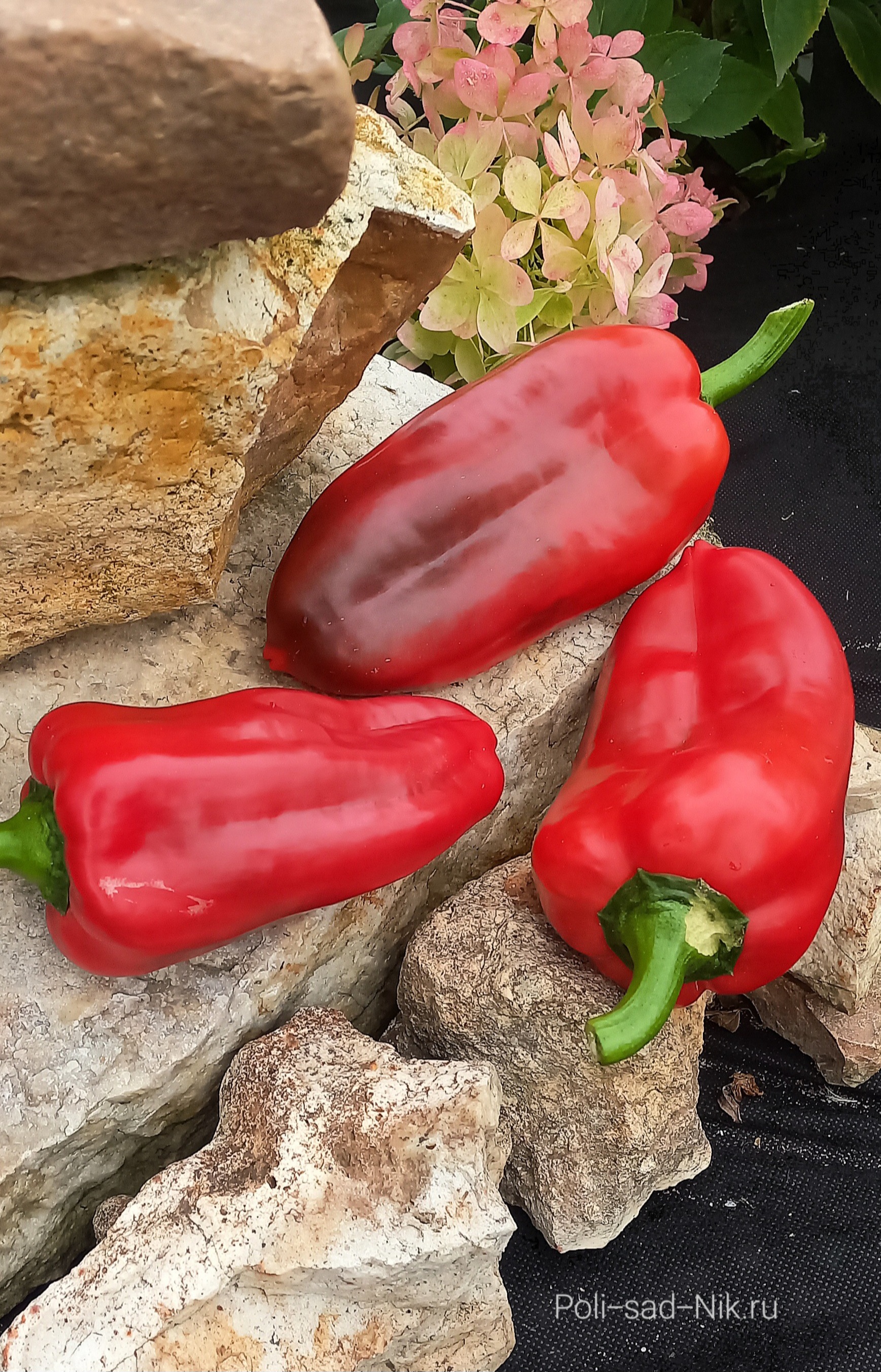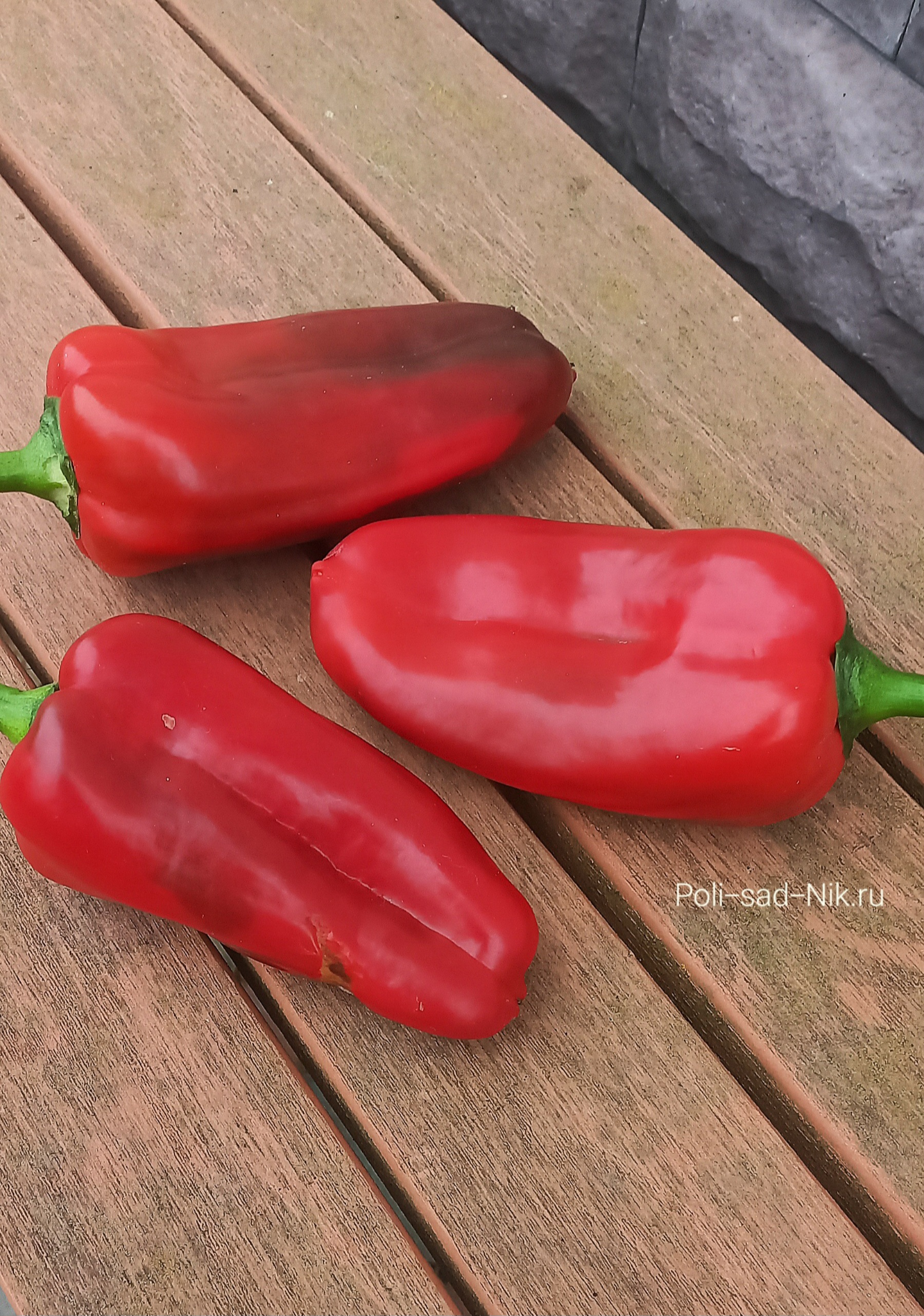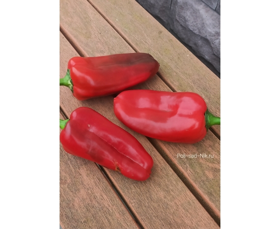Среднего срока созревания. Куст крепкий, высотой около 80 см. Плоды ярко- красные, глянцевые, крупные до 300 гр. Толщина стенки около 8 мм. Вкусные, сладкие, сочные. Отличная урожайность и длительное плодоношение! Прекрасный сорт!