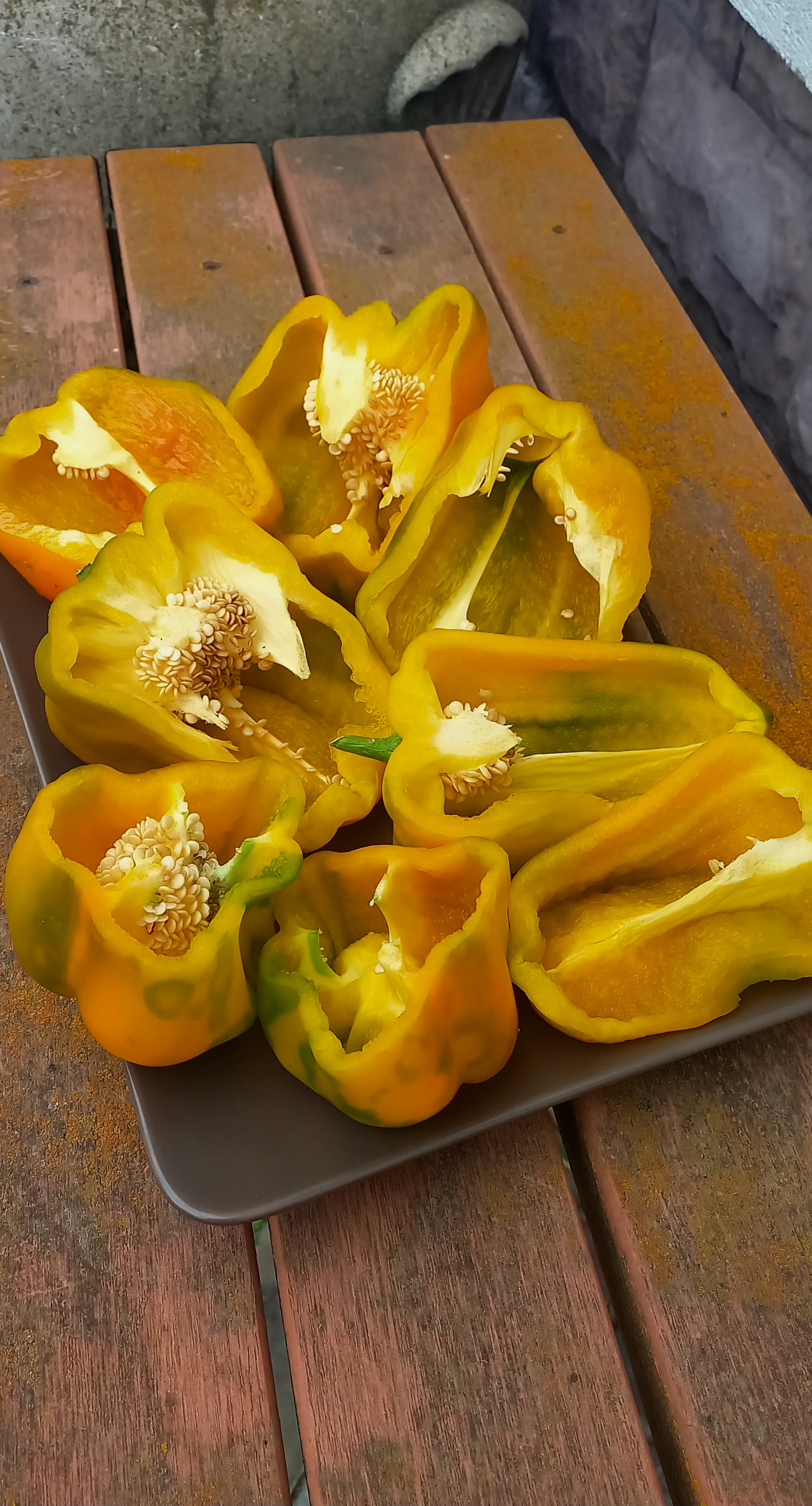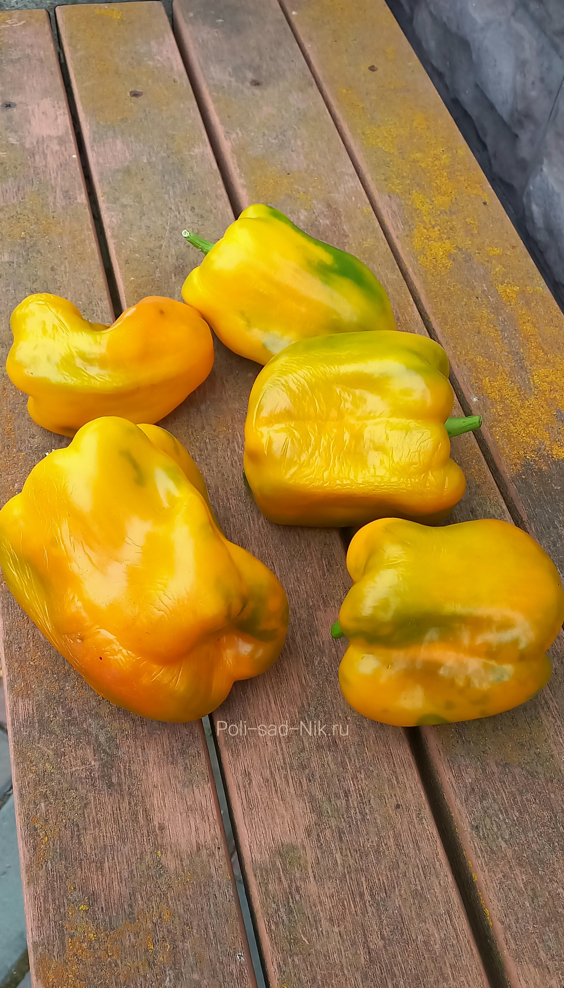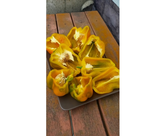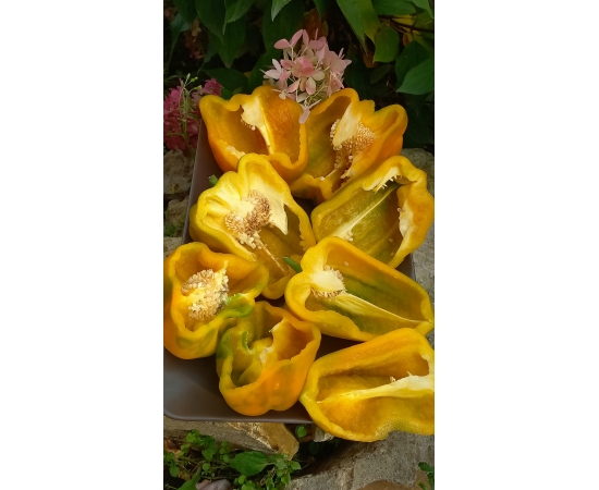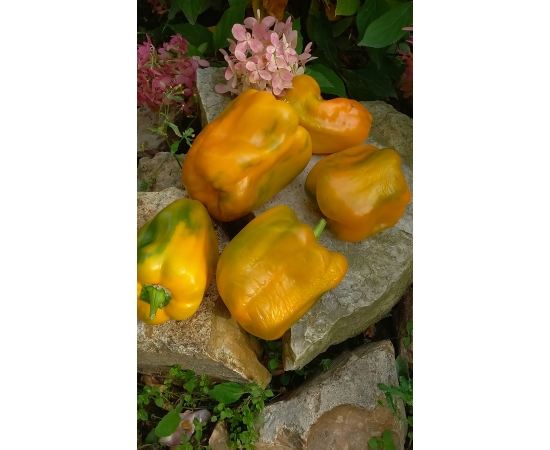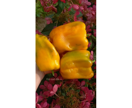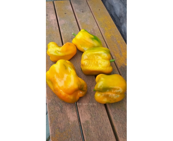 Сорт среднего срока созревания. Куст высотой до 80 см. Крепкий, раскидистый. Плоды ярко жёлтого цвета. крупные, кубовидные.массой до 400 гр. Мякоть сочная, сладкая, ароматна, толщина стенки 6-7 мм. Сорт мега урожайный! Один из фаворитов сезона 20251