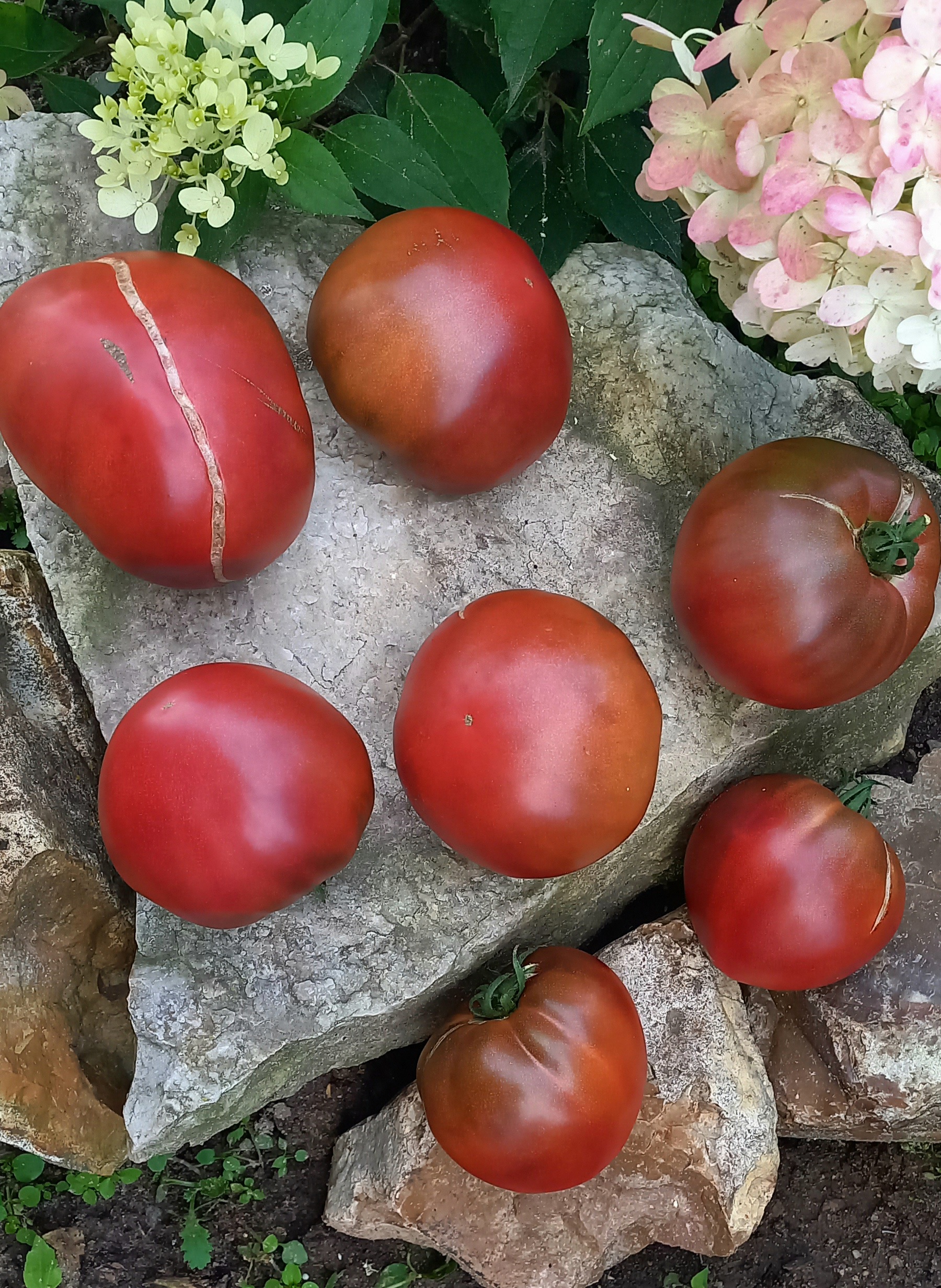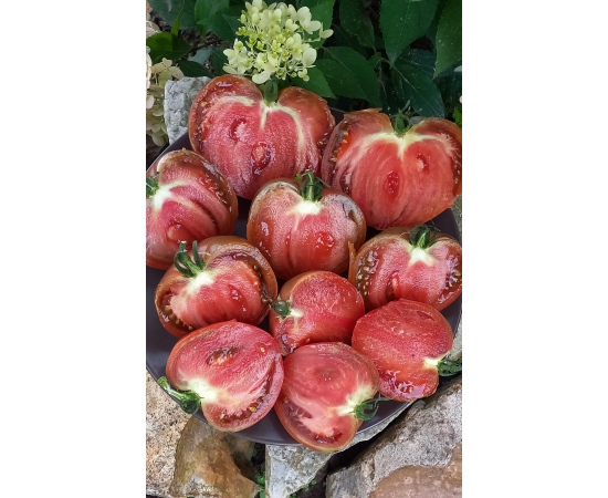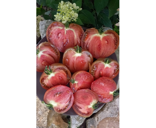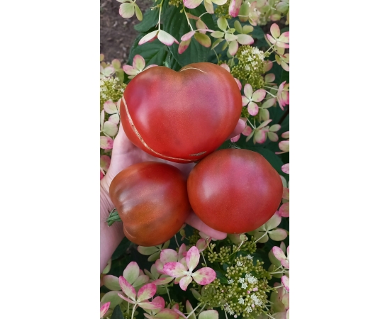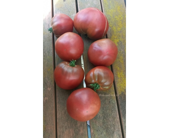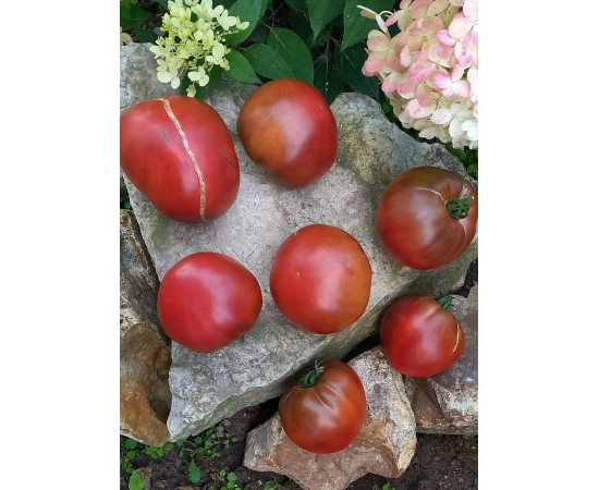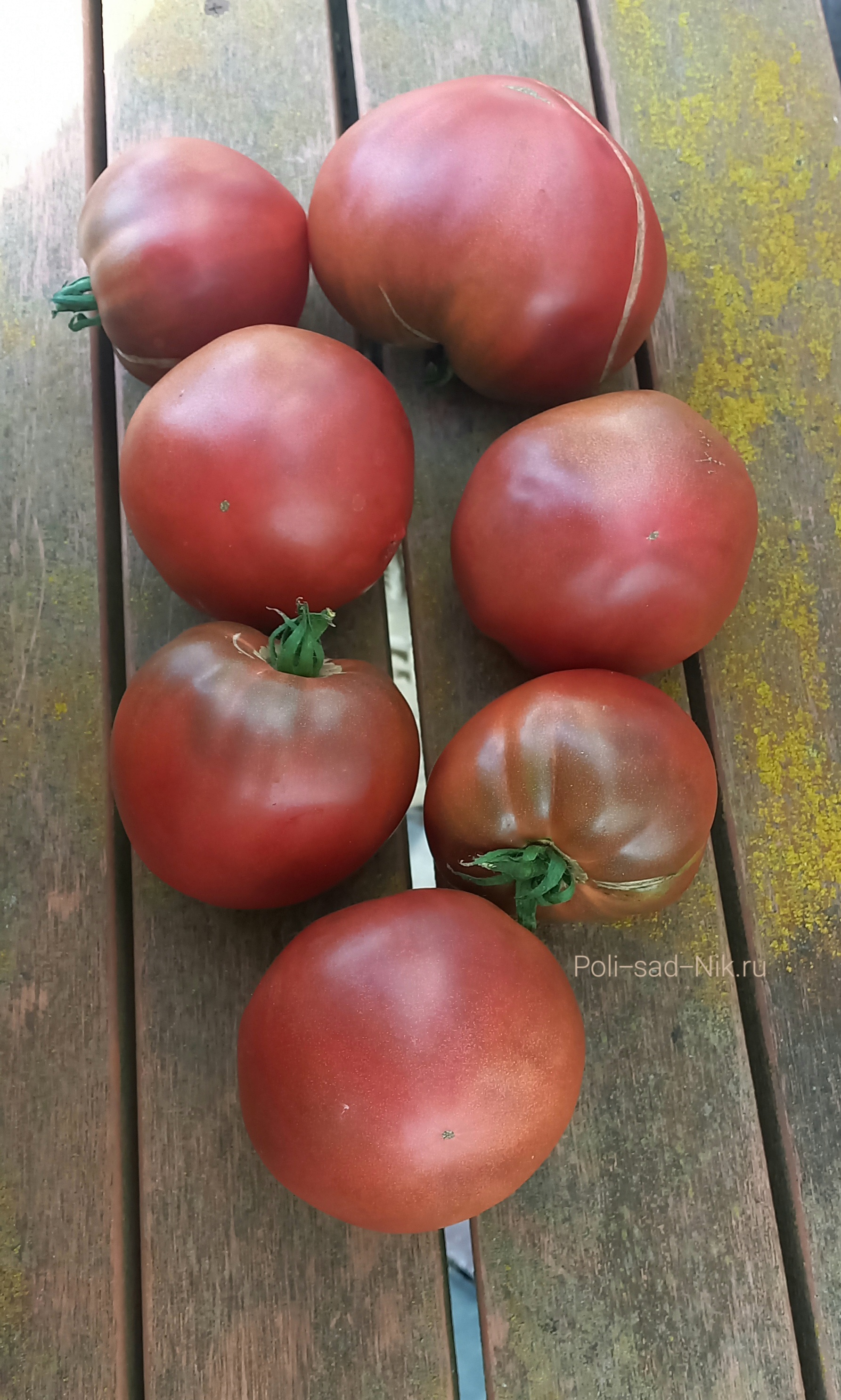 Среднего срока созревания. индетерминантный. Куст крепкого строения, очень урожайный. Плоды тёмно- кирпичного цвета. массой 300-400 гр. Мякоть мясистая, сочная, ароматная. Вкус насыщенный, пряный. Очень вкусные томаты. Универсального назначения.