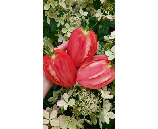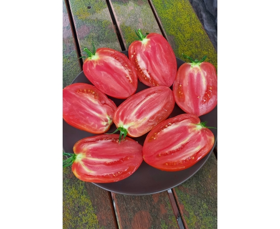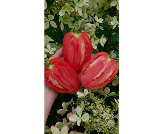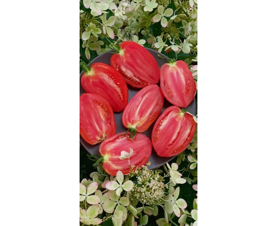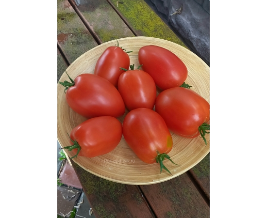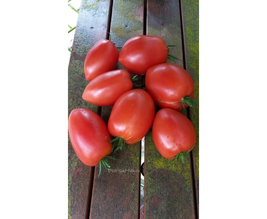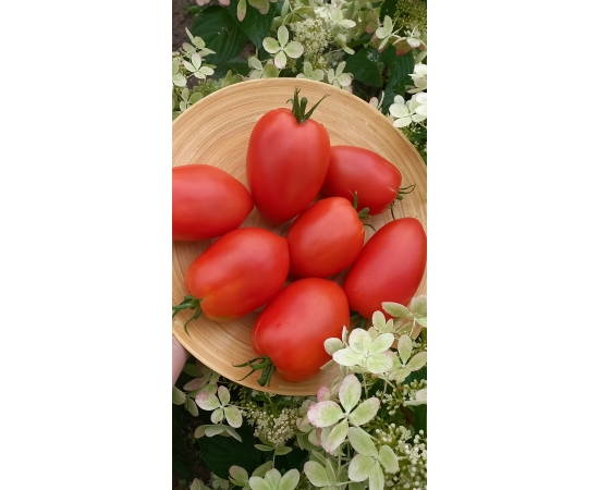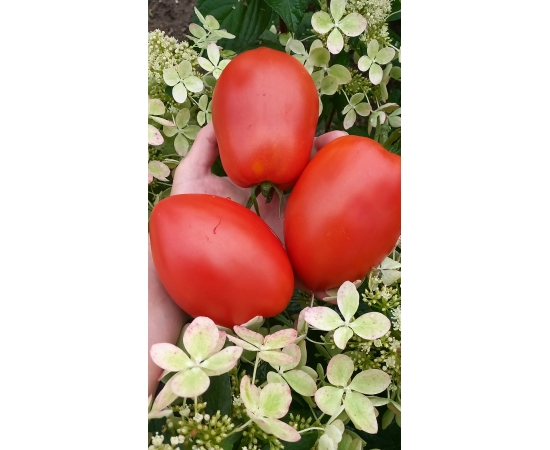 Индетерминантный, среднеранний сорт томата. Куст тонкого строения. Помидоры в форме удлиненной остроносой сливы, красные, массой 120-200 гр. Плотные, упругие, без пустот. Отличный насыщенный вкус. Для густых соусов, пасты, консервации. Сорт очень урожайный!
