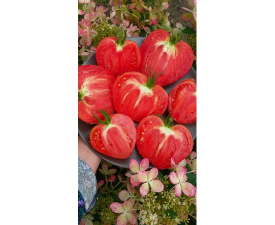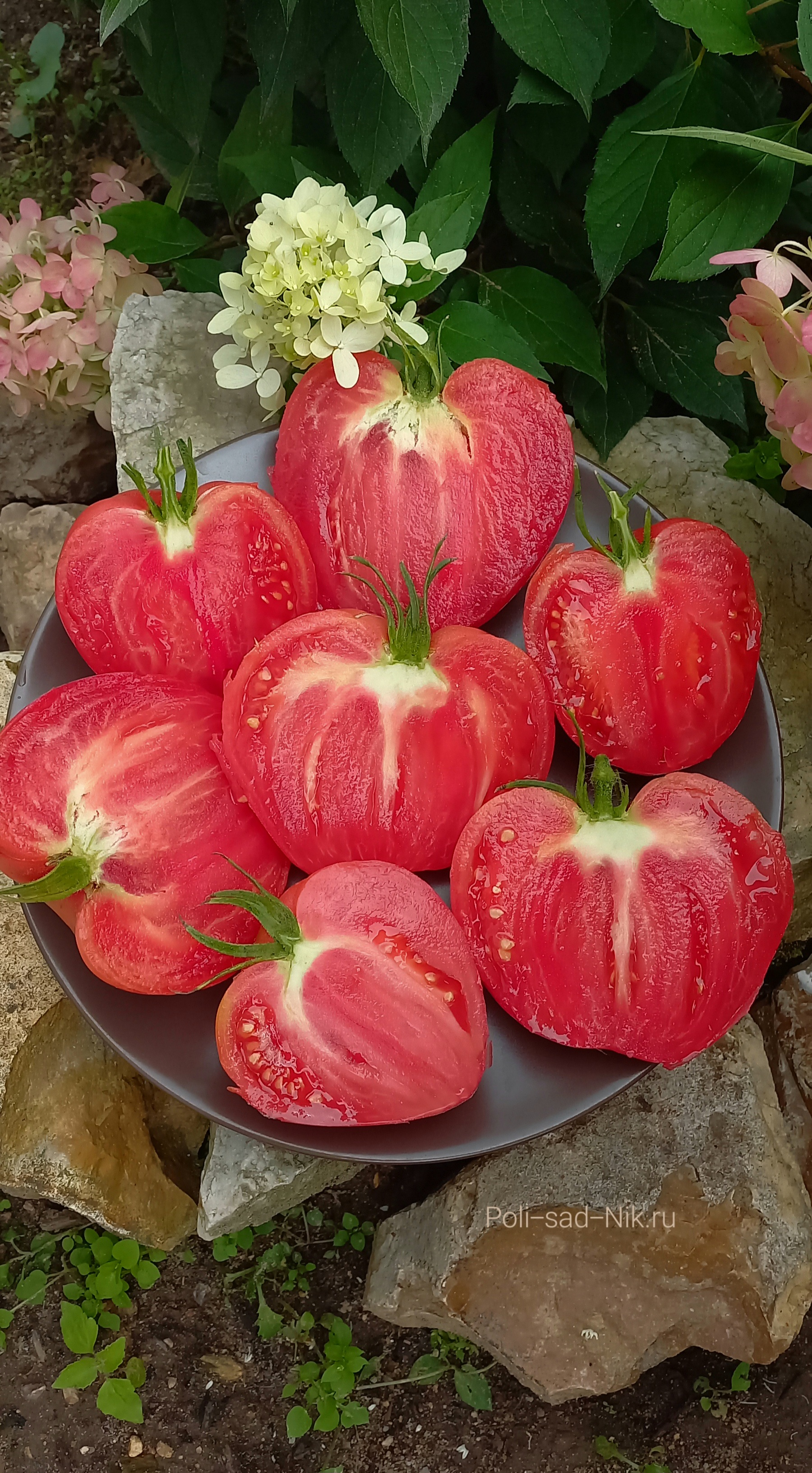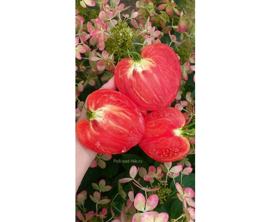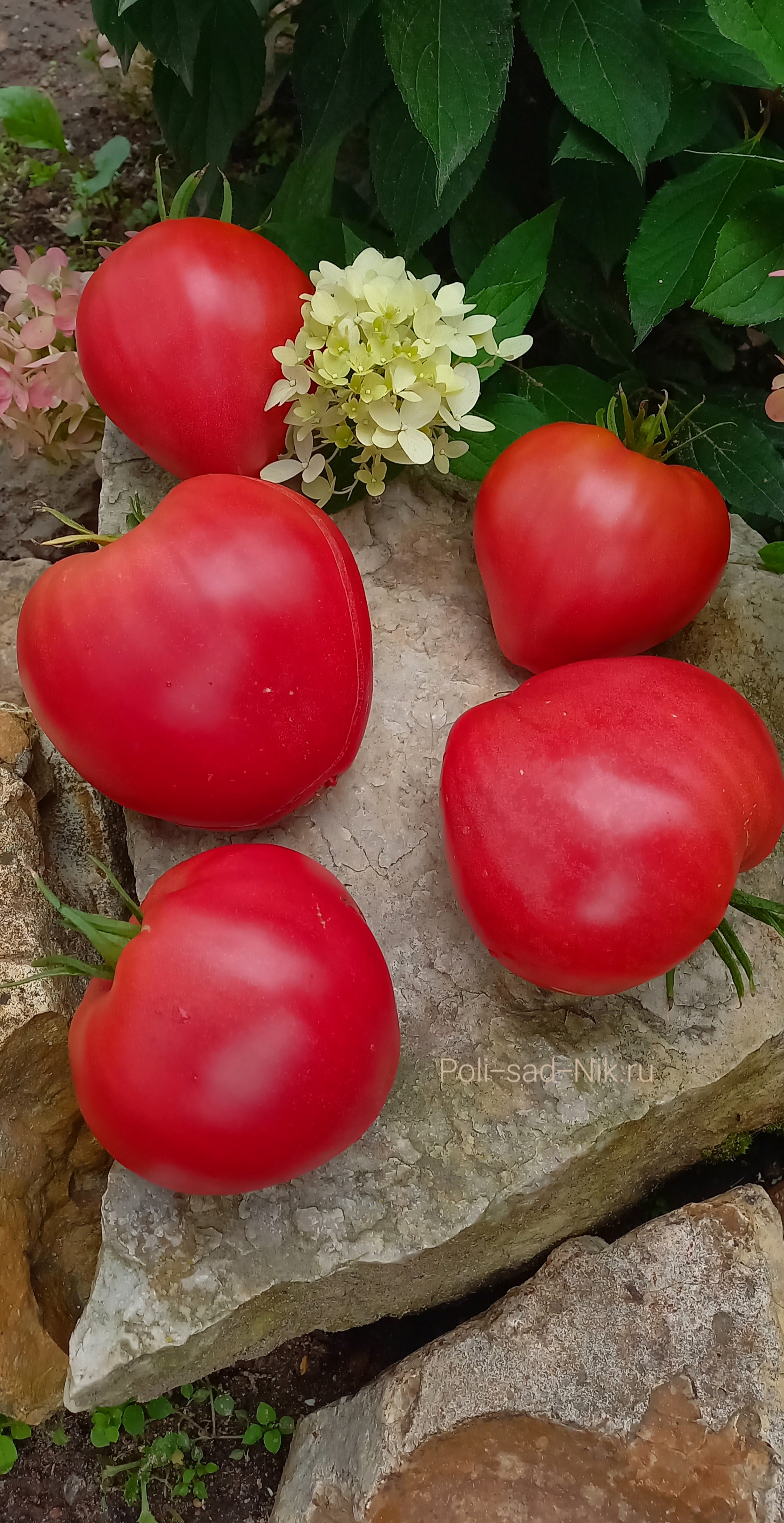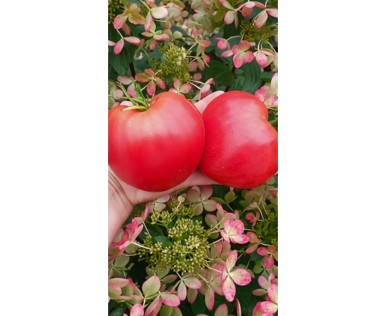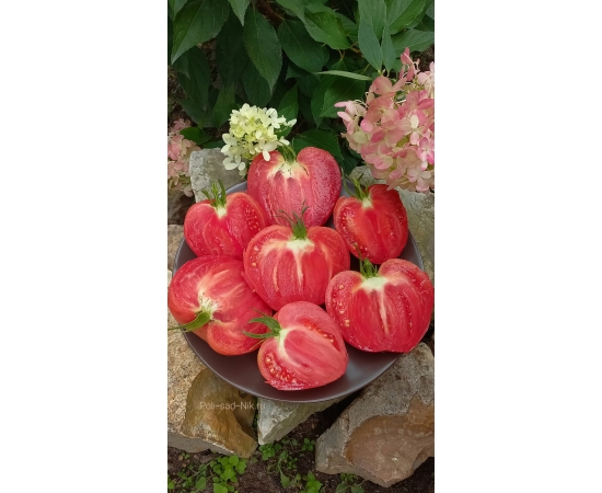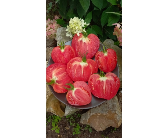 Среднего срока созревания. Куст индетерминантный, тонкого строения. Плоды массой 300-400 гр.сердцевидные, розово-малиновые, характерной формы, часто с тупым носиком. Мякоть сочная, вкусная. Вкус сбалансированный. Универсального назначения.