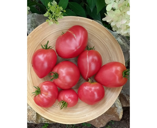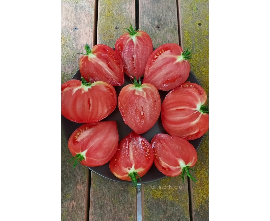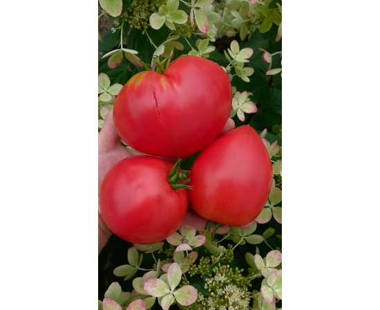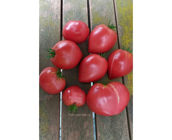 Сорт среднего срока созревания. Индетерминантный, куст тонкого строения. Плоды крупные, сердцевидной формы, малиново - розовые массой 200-300 г. Мякоть мясистая, сладкая.вкус насыщенный, настоящий томатный! Сорт хорош для приготовления паст, соусов и салатов! Урожайность прекрасная!