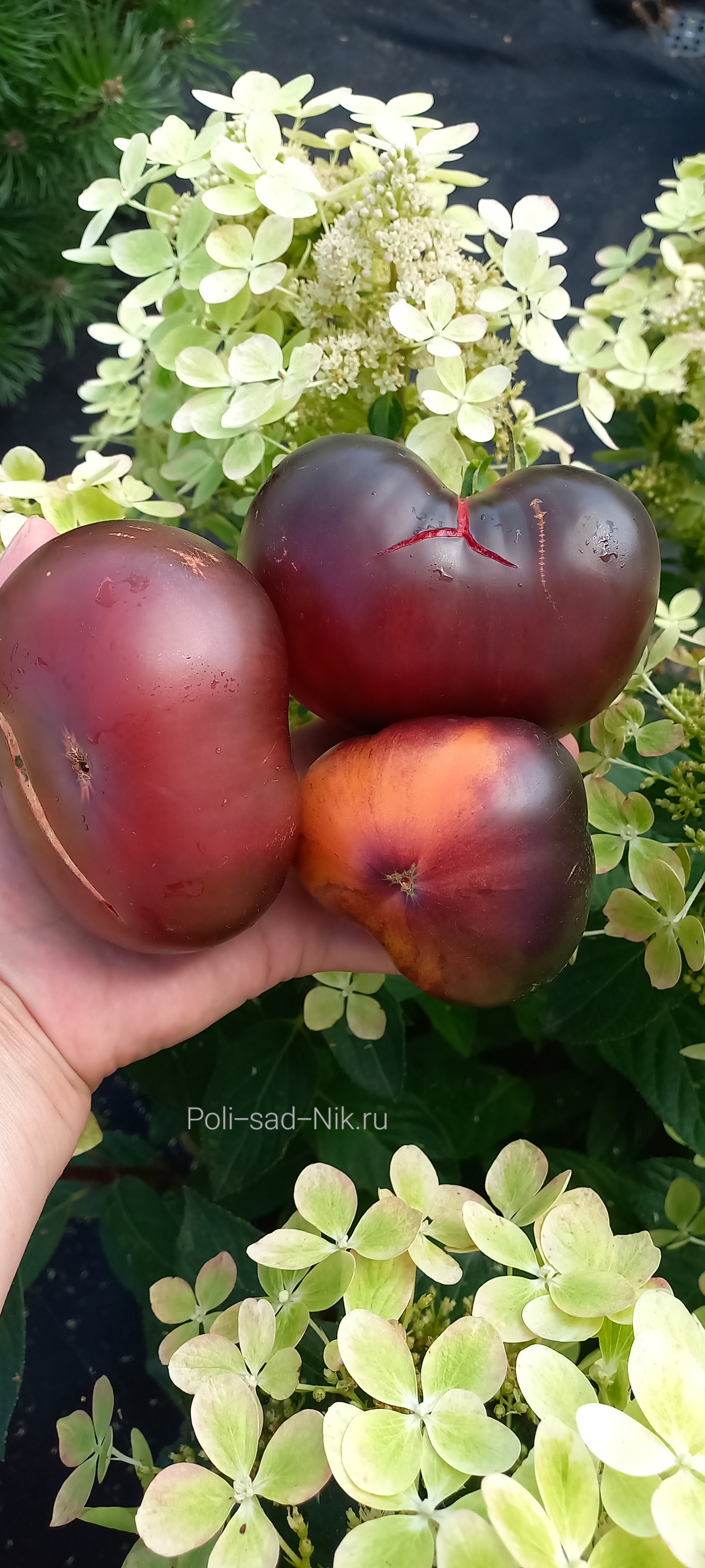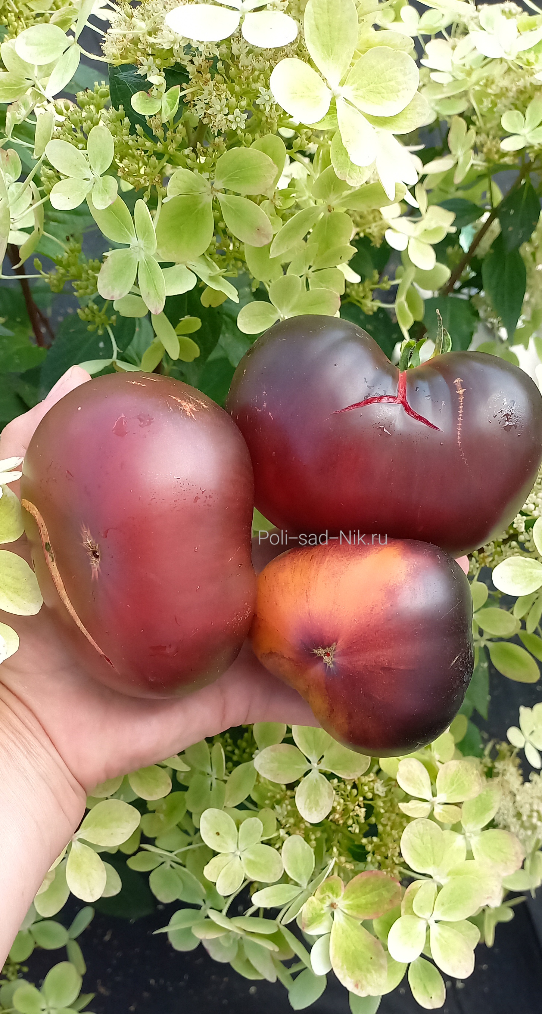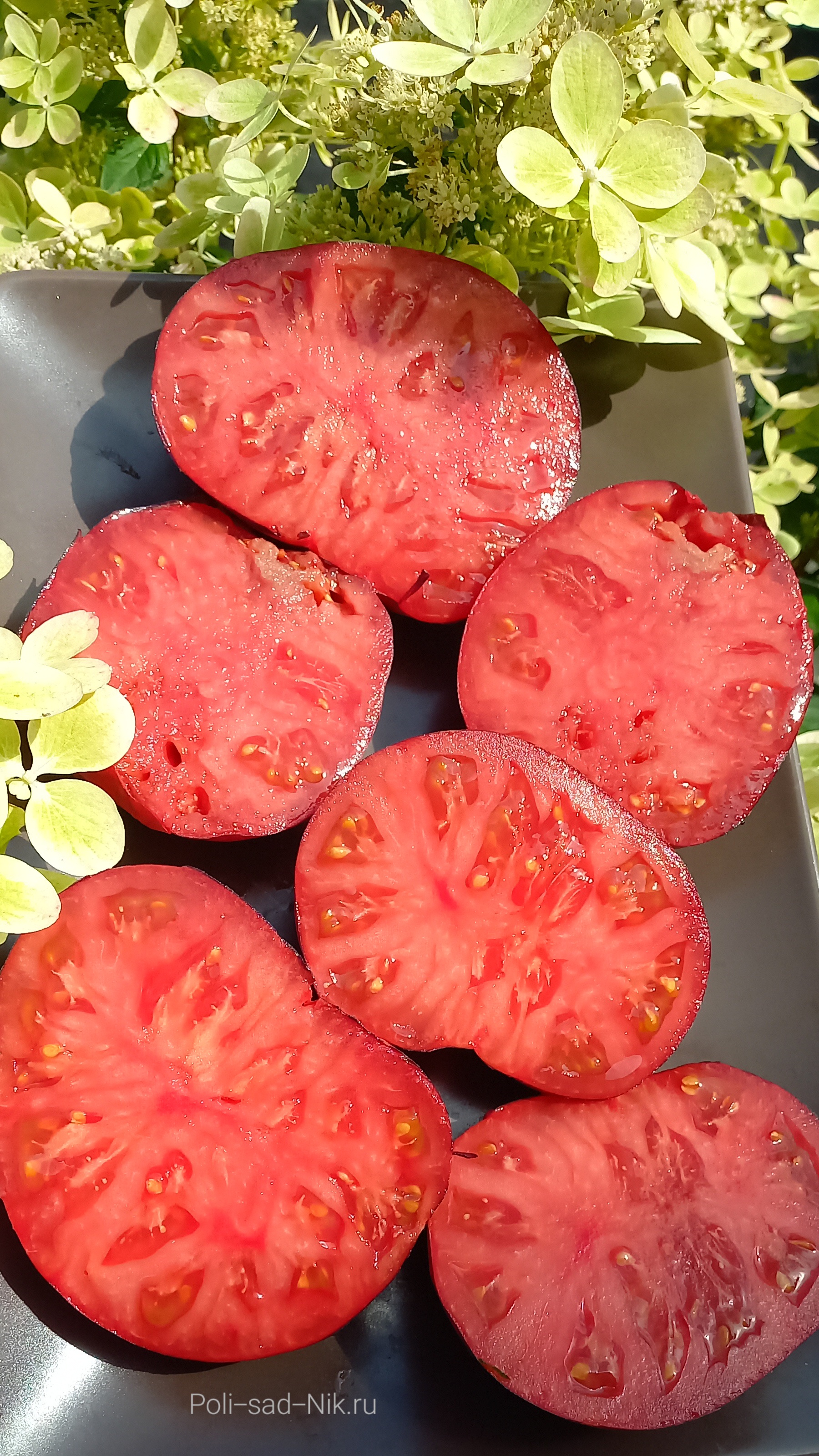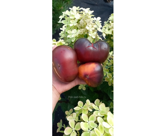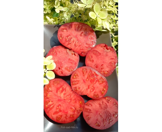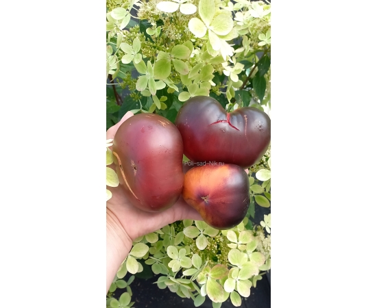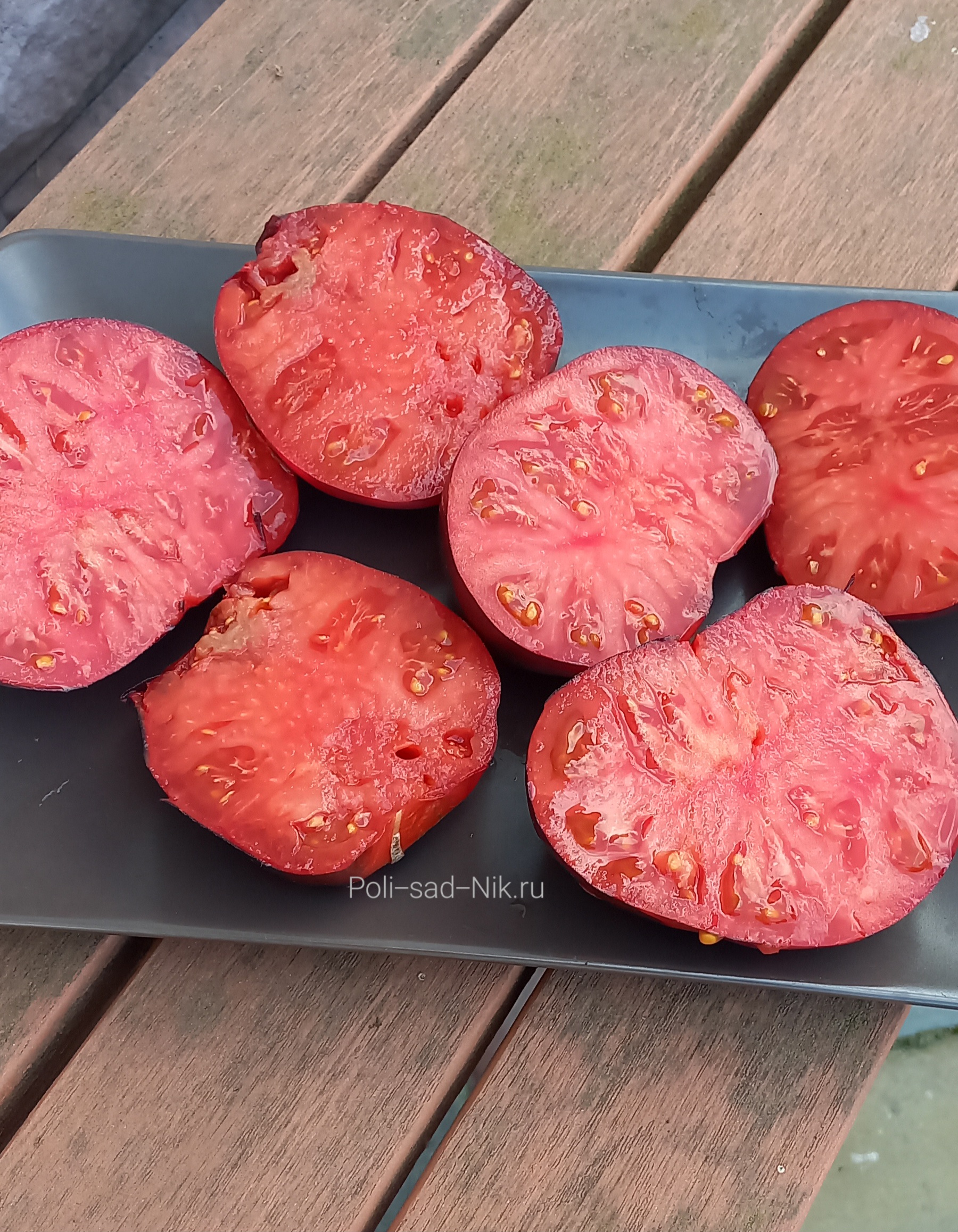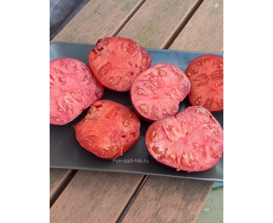 Среднего срока созревания, индетерминантный. Куст среднего строения, лист регулярный. Показал прекрасную урожайность! Интенсивная антоциановая окраска плечиков, малиновая верхушка плода. Плоды могут быть бифштексного типа и сердцевидные. Мякоть плотная , сладкая, мясистая с привкусом фруктовых ноток! Красивый сорт с ярким, оригинальным вкусом и богатым ароматом.
