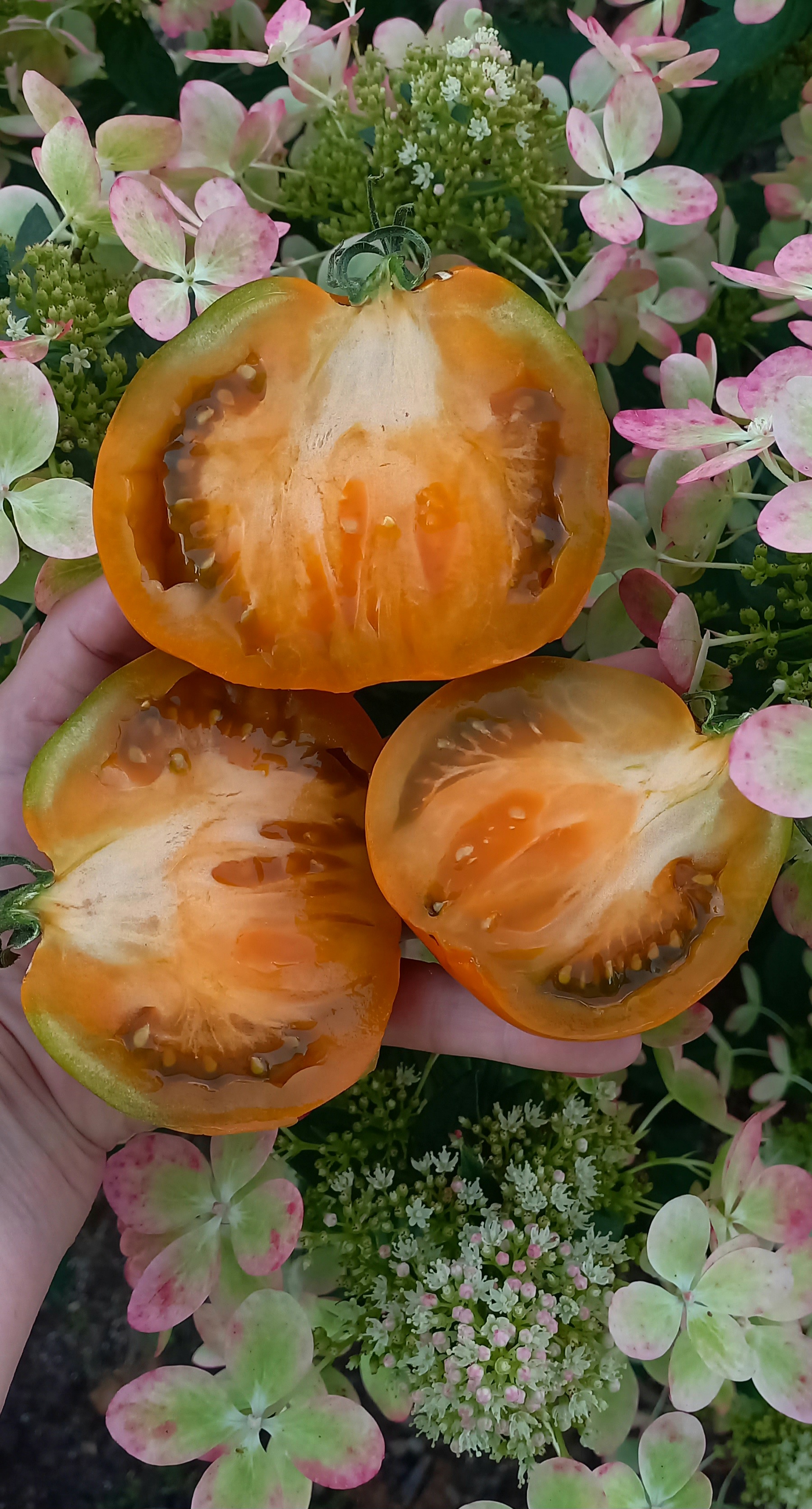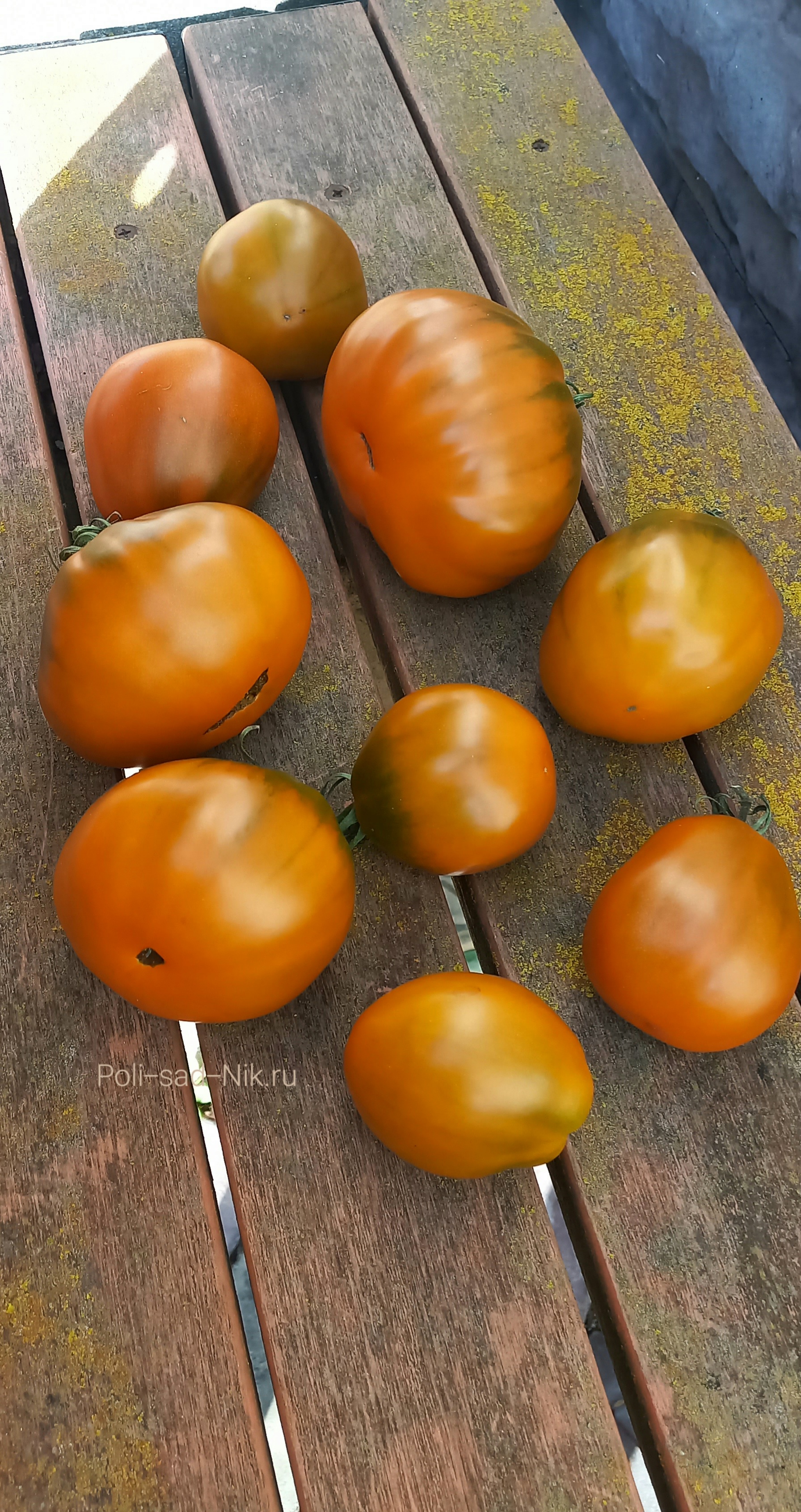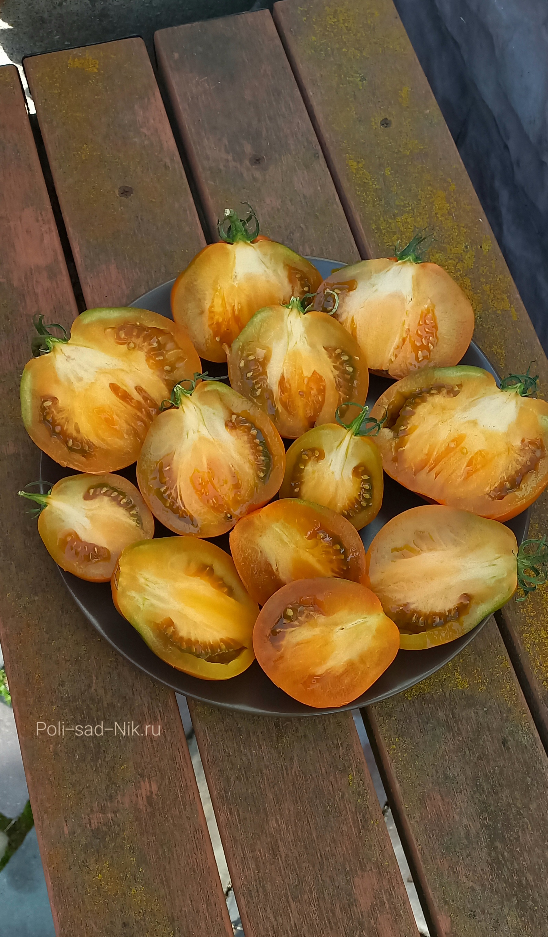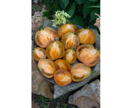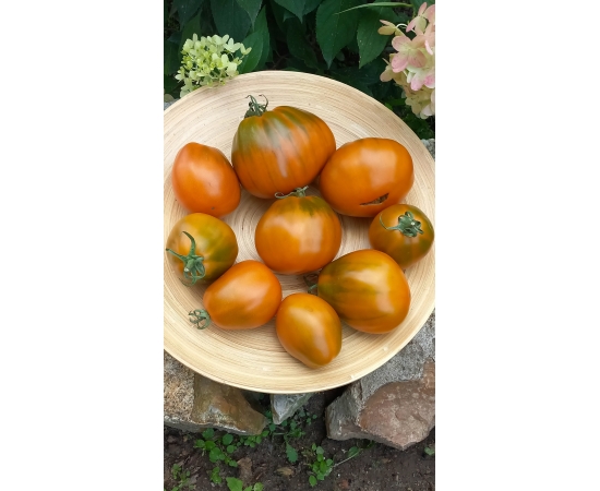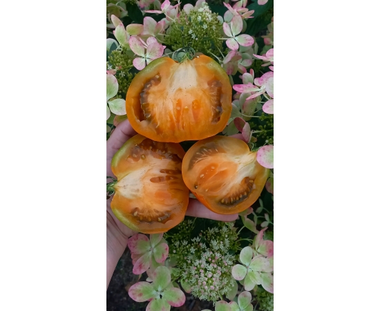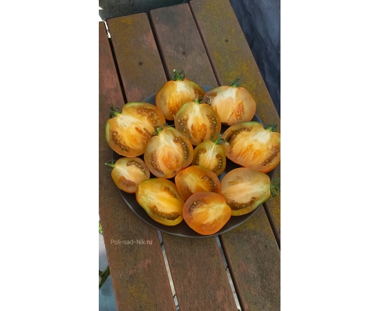 Мякоть горчичного цвета, мясистая, плотная, сочная! Вкус пикантный, фруктовый. Очень красивый, урожайный и вкусный сорт. Универсального назначения.